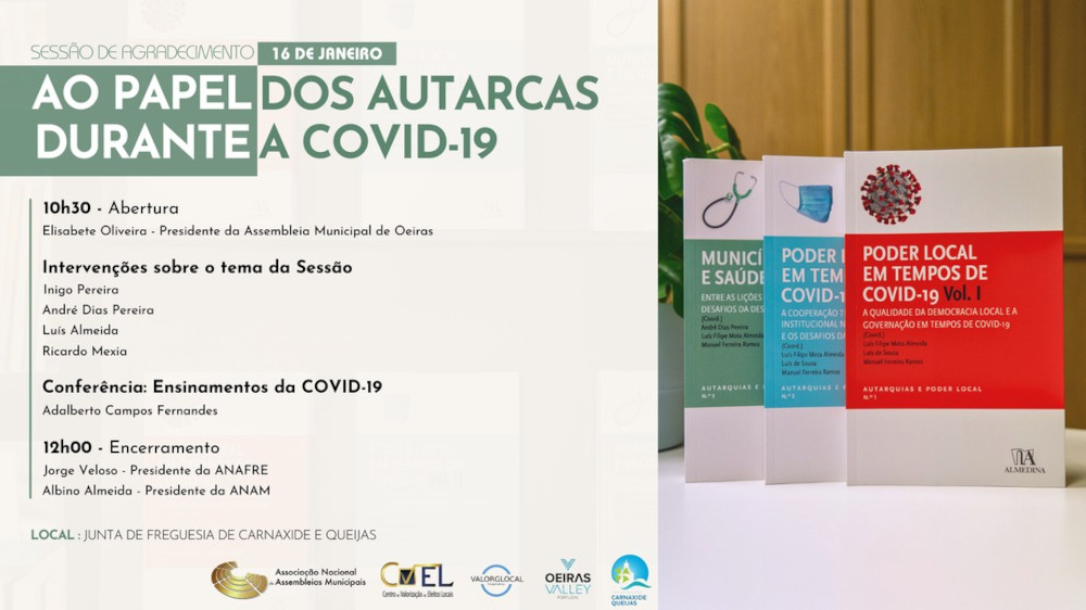 O Contributo dos autarcas durante a pandemia da Covid-19 é o mote da sessão de agradecimento que vai realizar-se no dia 16 de janeiro, quinta-feira, a partir das 10h30 no Salão Nobre da sede da União de Freguesias de Carnaxide e Queijas.