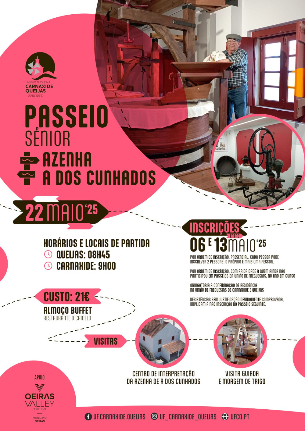 Estão abertas as inscrições para o próximo "Passeio Sénior" promovido pela União de Freguesias de Carnaxide e Queijas (UFCQ), que terá como destino a Azenha e A dos Cunhados (Centro de Interpretação - Visita guiada e moagem de trigo).