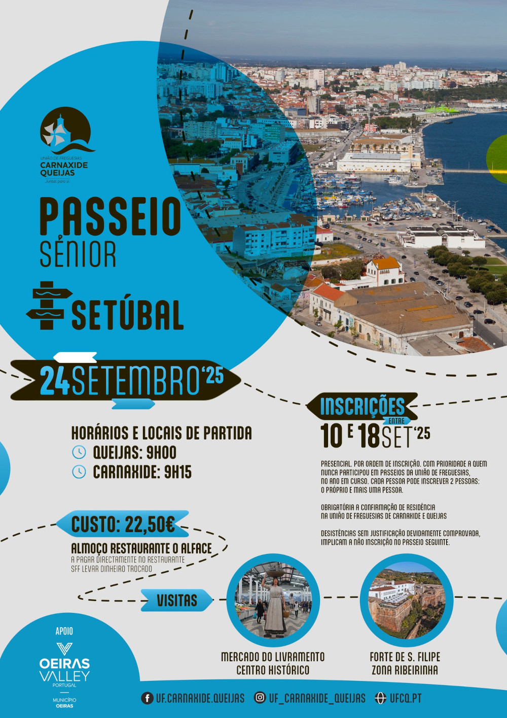 Estão abertas as inscrições para o próximo "Passeio Sénior" promovido pela União de Freguesias de Carnaxide e Queijas (UFCQ), que terá como destino a cidade de Setúbal.