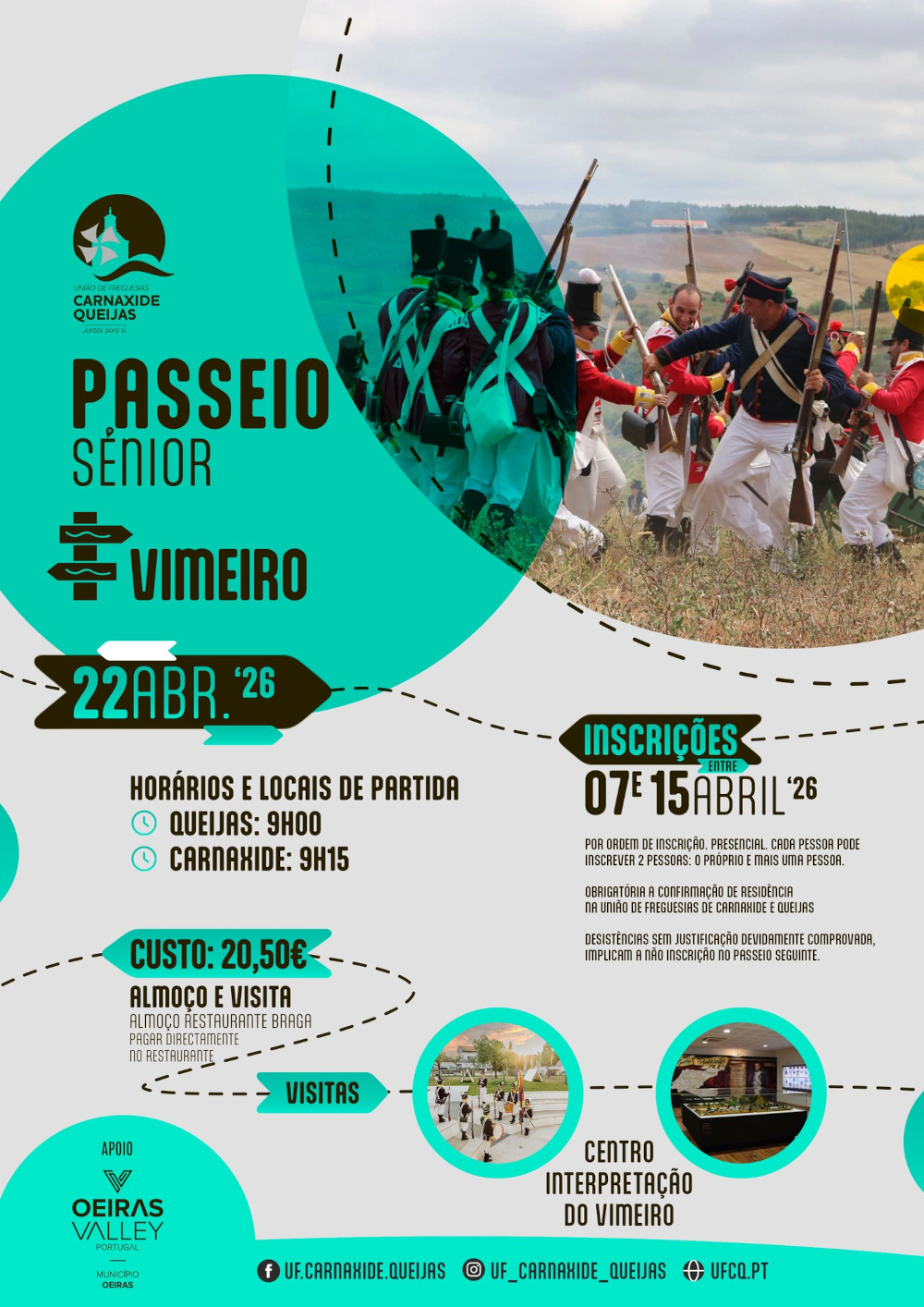 Estão abertas as inscrições para o próximo "Passeio Sénior" promovido pela União de Freguesias de Carnaxide e Queijas (UFCQ), que terá como destino o Vimeiro. Marque o seu lugar até dia 15 de abril nos serviços de atendimento ao público na sede (Carnaxide) e na delegação (Queijas).